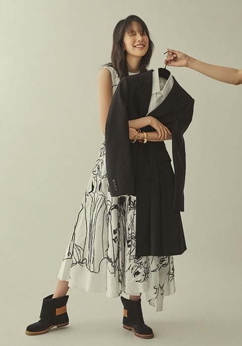 리넨 소재 댄싱 걸 비대칭 미디 드레스 4백78만원, 비대칭 이어링 가격 미정, 볼드한 와이어 브라스 브레이슬릿 85만원, 꼬임 디테일로 변주를 준 튜뷸러 브레이슬릿 1백26만원, 송아지가죽 커프 부츠 1백36만원, 모델이 안고 연출한 제품은 모두 남성용으로 화이트 코튼 셔츠 가격 미정, 울 개버딘 소재 하프 킬트 재킷 가격 미정 모두 알렉산더 맥퀸.
