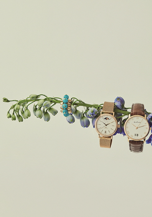 남성용 클래식 워치를 대표하는 빌레레 그랜드 데이트 워치. 다이얼 6시 방향에 위치한 커다란 날짜창이 특징으로, 레드 골드 케이스와 브라운 앨리게이터 스트랩을 매치했다. 2천5백만원대 블랑팡.