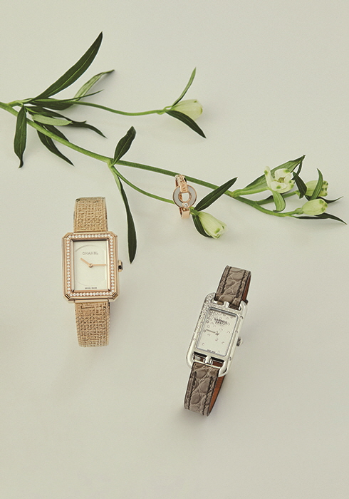 (왼쪽부터) 샤넬 고유의 아이덴티티를 담은 베이지 골드 케이스에 64개의 브릴리언트 컷 다이아몬드를 세팅하고, 트위드 패턴 브레이슬릿을 매치했다. 보이·프렌드 트위드 워치 미디엄 사이즈 5백40만원대 샤넬 워치.