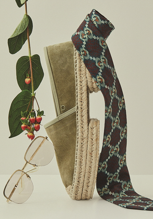 셔츠 스타일 스웨이드 재킷 7백만원대, 화이트 코튼 셔츠 80만원대, 발수성 코튼을 적용해 실용적인 나고야 팬츠 1백만원대, 부드럽고 가벼운 송아지가죽 샌들 1백만원대 모두 에르메스.