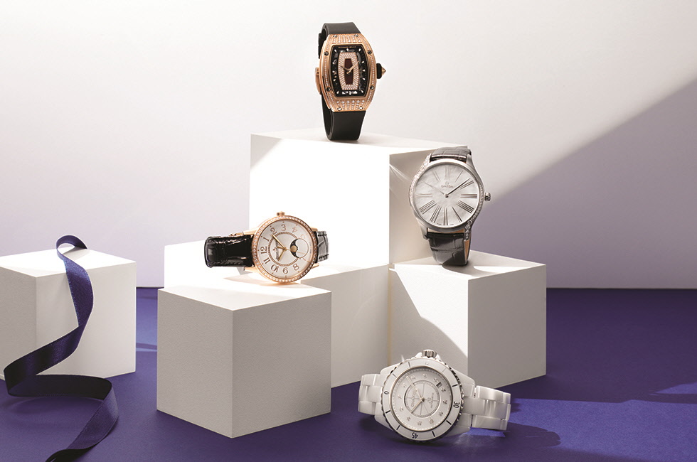 (위부터 시계 방향으로) 유니크한 토노 형태의 케이스에 여러 줄의 다이아몬드를 세팅해 화려한 매력을 강조한 RM 07-01 가격 미정 리차드 밀. 지름 39mm의 스틸 케이스 측면을 따라 유려한 곡선으로 이어지는 다이아몬드 장식이 우아한 드 빌 트레저 7백만원 오메가. 12개의 다이아몬드 인덱스를 더한 화이트 세라믹 J12 워치.