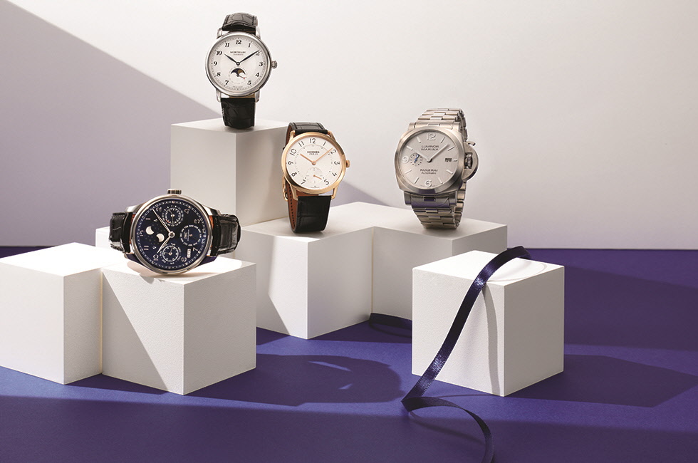 (왼쪽부터) 남반구와 북반구의 문페이즈를 포함한 퍼페추얼 캘린더, 연도 표시창을 갖춘 포르투기저 퍼페추얼 캘린더 워치. 화이트 골드 케이스의 지름은 44.2mm로 5천1백60만원 IWC. 지름 42mm의 스틸 케이스와 유백색 기요셰 다이얼의 6시 방향에 날짜 및 문페이즈 창을 더한 스타 레거시 문페이즈 5백28만원 몽블랑. 화이트 에나멜 다이얼을 장식한 미니멀한 블랙 에나멜 인덱스가 감각적인 로즈 골드 슬림 데르메스 워치. 케이스 지름 39.5mm로 2천2백만원대 에르메스. 지름 44mm의 브러시드 스틸 케이스를 장착한 견고한 디자인의 루미노르 마리나 브레이슬릿 워치. 인하우스 매뉴팩처 칼리버 P.9010으로 구동하며 72시간의 파워 리저브 및 300m 방수 기능을 제공한다. 1천만원대 파네라이.