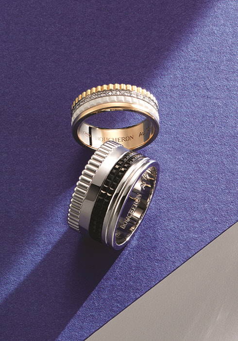 고유의 모티브를 지닌 4개의 밴드를 결합한 디자인이 멋스러운 콰트로 컬렉션. 옐로·화이트·핑크 골드와 화이트 세라믹 소재의 화이트 에디션 스몰 링 4백만원대, 화이트 골드와 블랙 PVD 소재를 사용한 블랙 에디션 라지 링 7백만원대 모두 부쉐론.