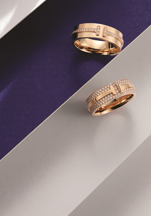 한줄의 다이아몬드 장식으로 보다 심플한 느낌을 연출한 로즈 골드 티파니 T 투 링, 알파벳 T 모티브를 제외한 로즈 골드 밴드 전체에 다이아몬드를 파베 세팅한 티파니 T 투 링 모두 가격 미정 티파니.