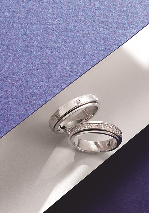 중앙의 링이 회전하는 화이트 골드 소재 포제션 커플 밴드. 7개의 브릴리언트 컷 다이아몬드로 포인트를 더한 포제션 링, 37개의 브릴리언트 컷 다이아몬드를 세팅해 화사하게 빛나는 포제션 링 모두 가격 미정 피아제.
