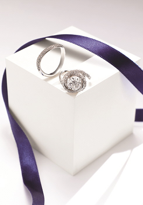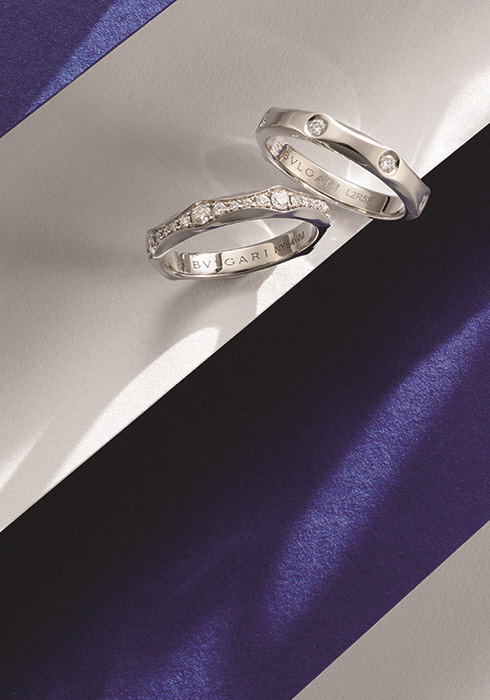 바다의 물결처럼 끝없이 이어지는 영원한 사랑을 의미하는 인피니토 웨딩 밴드. 플래티넘 밴드에 0.23캐럿 다이아몬드를 세팅한 링 3백54만원, 0.56캐럿 다이아몬드를 풀 파베 세팅한 링 5백30만원 모두 불가리.