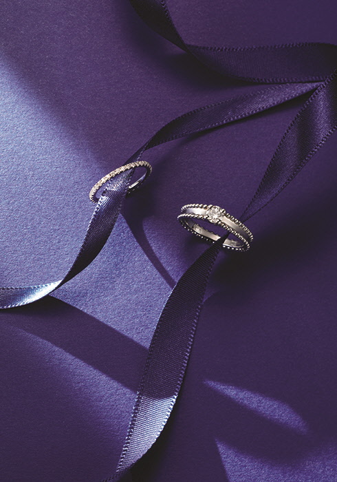 밴드 둘레를 장식한 정교한 플래티넘 비즈 디테일이 돋보이는 에스텔 솔리테어 링 7백50만원, 라운드 컷 다이아몬드를 세팅한 화이트 골드 펠리시테 웨딩 밴드 4백50만원 모두 반클리프 아펠.