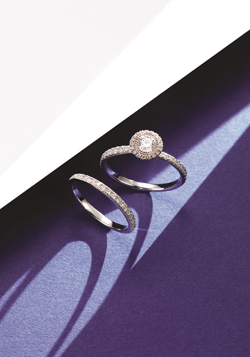 프랑스어로 날개를 뜻하는 쁠륌(Plume) 컬렉션의 웨딩 밴드. 새의 날개가 맞닿아 있듯 서로 이어진 연인의 마음을 형상화한 디자인이 특징으로, 핑크 골드 밴드와 브릴리언트 컷 다이아몬드를 세팅한 밴드 모두 가격 미정 쇼메. 워치 컬렉션에서 모티브를 가져온 타임리스한 디자인이 돋보이는 컨스텔레이션 웨딩 밴드. 단면에 인그레이빙 장식을 더한 화이트 골드 컨스텔레이션 링 1백95만원, 총 0.48캐럿에 달하는 50개의 다이아몬드를 세팅한 컨스텔레이션 링 4백50만원 모두 오메가. 입체적이고 기하학적인 형태로 눈길을 끄는 사쿠라골드 소재 트라페지오 웨딩 밴드 모두 가격 미정 타사키. 그래픽적인 울트라 모티브의 화이트 골드 밴드에 센터 스톤을 장식한 커플 링. 각각 블랙과 화이트 세라믹을 적용한 것으로 각 5백40만원 샤넬.
