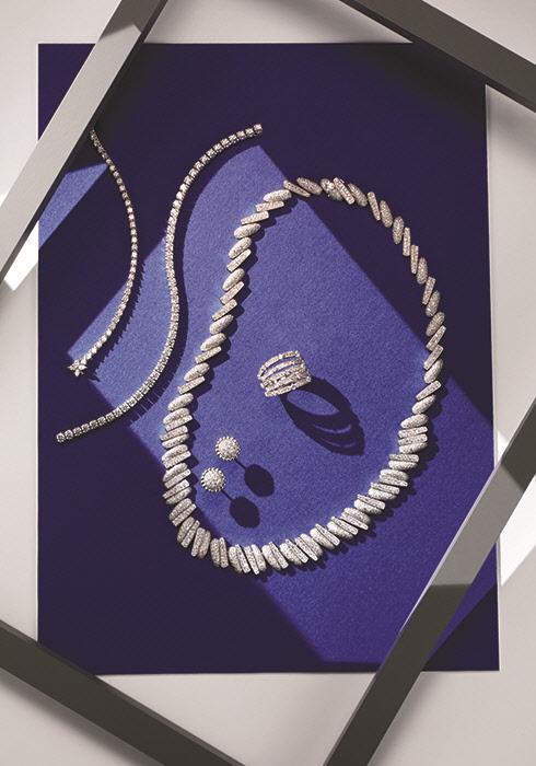 밤하늘의 영롱한 별빛에서 영감을 얻은 빅토리아 컬렉션 라인 브레이슬릿. 플래티넘 보디에 마키즈 컷, 라운드 브릴리언트 컷 다이아몬드를 세팅했다. 가격 미정 티파니. 총 6.38캐럿의 브릴리언트 컷 다이아몬드로 장식한 화이트 골드 에센셜 라인 브레이슬릿 5천7백만원대 까르띠에. 총 13.8캐럿에 달하는 다이아몬드 1천5백85개가 압도적인 광채를 발산하는 석세스 셀레브레이션 네크리스 1억3천3백만원대 프레드. 화이트 골드 소재의 빼를리 다이아몬드 이어링 1천5백만원대 반클리프 아펠. 밀그레인 세공으로 하프의 아름다운 음색을 형상화한 리르 다이아몬드 링 가격 미정 루시에.