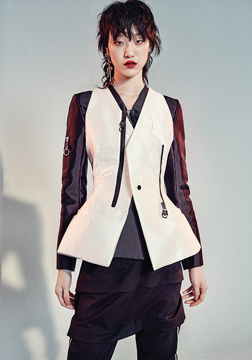 블랙 지퍼 디테일 재킷, 코르셋을 착용한 듯 굴곡이 돋보이는 화이트 베스트, 블랙 배기팬츠, 골드 컬러 드롭 이어링 모두 가격 미정 루이 비통.