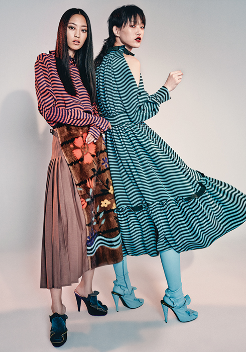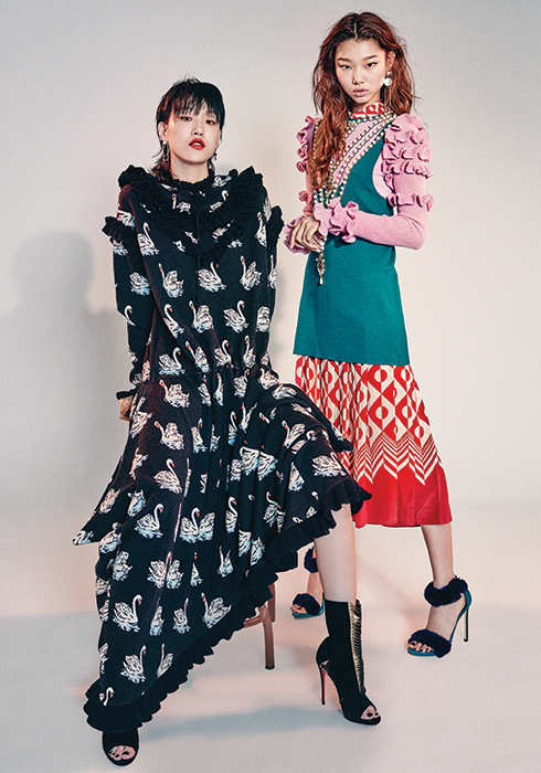 (오른쪽) 진주 장식과 러플 디테일이 사랑스러움을 자아내는 니트 미니드레스 4백78만원, 그래픽적인 패턴이 돋보이는 롱 드레스 3백98만원 모두 구찌. 실버 미러 이어링 14만원 넘버링. 퍼를 트리밍한 스트랩 힐 가격 미정 스튜어트 와이츠먼.