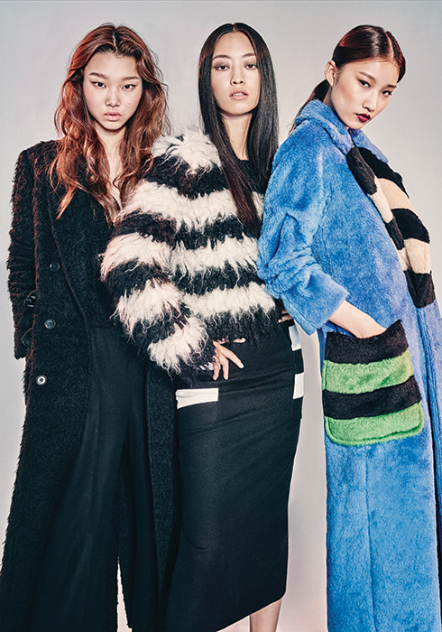 (가운데) 블랙 & 화이트 퍼 톱, 블랙 컬러 미디스커트 모두 가격 미정 막스마라.