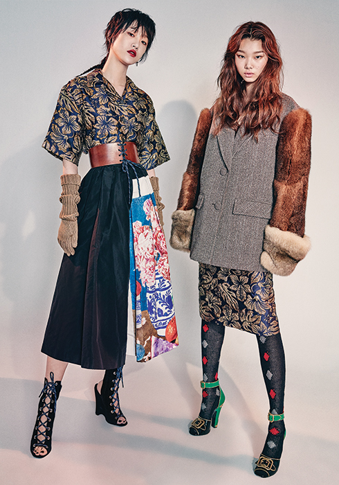 (왼쪽) 큼직한 플라워 패턴의 클로켓 셔츠 1백만원대, 브라운 컬러 레더 뷔스티에 60만원대, 다양한 소재와 패턴을 패치워크한 롱스커트 2백90만원대, 벨벳 소재의 앵클부츠 가격 미정, 브라운 니트 글러브 가격 미정 모두 프라다.