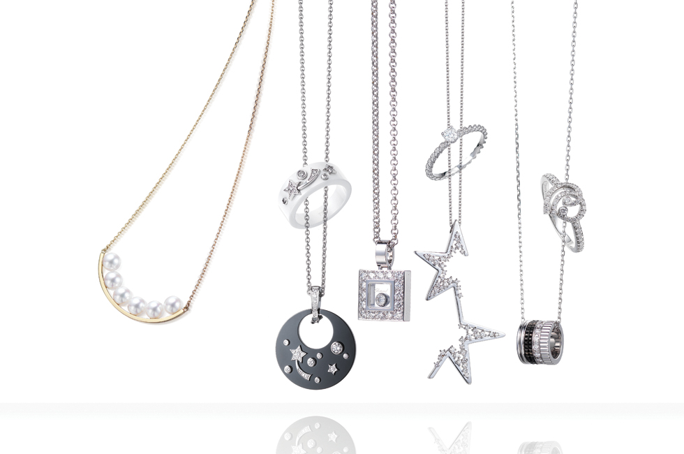 타사키 밸런스 플러스 네크리스 곡선미 있게 세팅한 아코야 진주가 아름다운 네크리스 2백90만원. 샤넬 화인 주얼리 울트라 컬렉션 링 화이트 세라믹에 화이트 골드, 다이아몬드를 세팅한 새로운 디자인의 링 4백만원대. 샤넬 화인 주얼리 울트라 컬렉션 펜던트 강렬한 블랙 세라믹에 다이아몬드로 밤하늘을 표현한 뉴 컬렉션 8백만원대. 쇼파드 해피 다이아몬드 네크리스 사각형 케이스 안에서 다이아몬드가 자유롭게 움직이는 매력적인 네크리스 5백만원대. 부쉐론 쎄뻥 보헴 화이트 골드 쏠리테어 링 세밀하게 세공한 트위스트 체인에 0.2캐럿 다이아몬드를 세팅한 링 4백만원대. 타사키 어브스트랙 스타 네크리스 반짝이는 별의 윤곽선을 다이아몬드로 표현한 새로운 디자인의 네크리스 6백30만원대. 부쉐론 쿼트르 펜던트 블랙과 화이트 골드, 다이아몬드를 세팅한 정교한 세공이 돋보이는 펜던트 9백만원대. 티파니 인챈트 하트 링 물방울이 맺혀 있는 듯 더블 하트를 묘사한 다이아몬드 링 5백만원대.