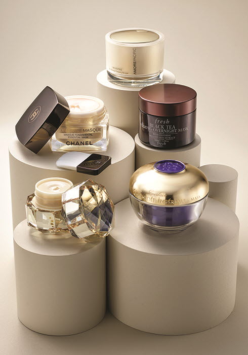 ‘끌레드뽀 보떼 라 크렘므’는 고가의 가격대만큼이나 텍스처, 향, 성분, 효과까지 어느 것 하나 빠지지 않는, 럭셔리한 경험을 선사할 페이셜 크림 겸용 마스크다. 일루미네이팅 콤플렉스EX가 세포 스트레스를 차단해 피부를 빛나게 하고, 시호 추출물이 피부를 촘촘하게 해 탄력 있는 피부를 완성한다. 평소에는 데일리 크림으로 사용하고 좀 더 집중적인 트리트먼트가 필요한 밤에는 도톰하게 발라 수면 팩 대신 사용하면 좋다(30ml 68만원대). ‘샤넬 수블리마지 마스크’는 피부 재생과 영양 공급에 탁월한 효과를 겸비해 이 마스크 하나만으로도 토털 안티에이징 케어가 가능하다. 피부를 위한 모든 생명 인자에 작용해 피부를 재건하고 피부 세포 스트레스를 완화하는 효과가 뛰어나다. 일주일에 1~3회 정도 자기 전, 내장된 탄력 있고 부드러운 브러시를 활용해 얼굴에 펴 바른 다음 10분 뒤 티슈로 닦아내면 피부의 촉촉함과 편안함이 다음 날까지 유지되는 것을 느낄 수 있다(50ml 26만5천원). ‘아모레퍼시픽 타임 레스폰스 스킨 리뉴얼 슬리핑 마스크’는 무려 34번의 겨울을 이겨낸 34년 된 녹차나무 뿌리의 고귀하고 강력한 생명력을 담은 성분을 함유해 밤사이 맑고 탄력 있는 피부로 가꿔주는 안티에이징 슬리핑 마스크다. 녹차 뿌리에 다량 함유된 풍부한 사포닌과 정화 작용을 하는 GABA 성분이 딥 디톡스를 도와 피부 스트레스를 완화하고 칙칙한 톤을 맑게 개선한다(50ml 22만원). ‘프레쉬 블랙티 퍼밍 오버나이트 마스크’는 일명 ‘코르셋 마스크’라는 애칭이 있는 나이트 마스크로, 밤 동안 코르셋처럼 피부를 쫀쫀하고 탄력 있게 조여준다. 피부 탄력을 집중적으로 끌어올릴 블랙티 콤플렉스 성분과 밤에 피는 꽃으로 알려진 분꽃 성분을 함유해 흐트러진 피부 밸런스를 빠르게 회복시킨다. 마스크 효과를 보려면 7시간 동안 숙면과 함께 사용하는 것이 가장 좋으니 참고할 것(100ml 14만2천원). ‘겔랑 골드 오키드 마스크’는 이미 두꺼운 마니아층을 확보한 럭셔리 수면 마스크로, 집에서도 고급 스파 케어를 받은 듯한 효과를 선사한다는 점에서 인기가 높다. 피부에 활력을 주는 골드 오키드 테크놀로지를 결합한 새로운 포뮬러에 콩 단백질 추출물과 망고 시드 버터를 더해 더욱 빠르고 집중적인 효과를 선사한다. 기분까지 편안하게 만드는 풍부하고 크리미한 텍스처로, 10분간 팩을 하는 동안에도 영양이 듬뿍 흡수되고 있음을 직접 느낄 수 있다(75ml 49만원대).