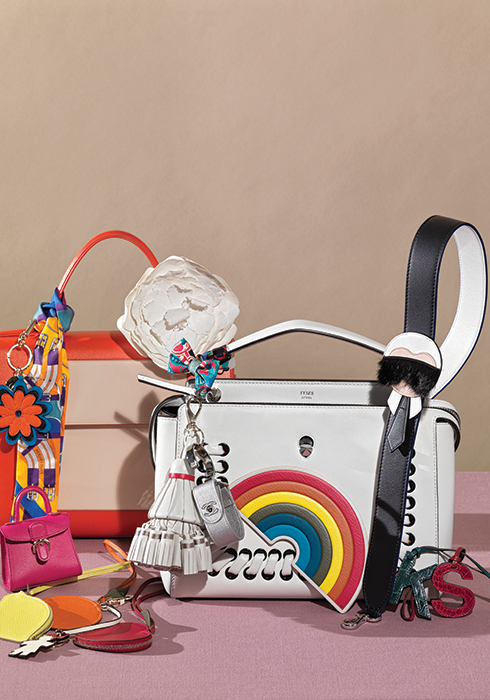컬러풀한 투톤 컬러 포인트의 톰페트 토트백 32X25cm, 1천만원대, 화이트 가죽 소재로 만든 플라워 참 80만원대 모두 델보. 핸들 한쪽에 감은 트윌리 실크 스카프 20만원대 에르메스. 팝아트적인 색감이 돋보이는 꽃무늬 키 링 45만원대 로저 비비에. 앞에 놓인 브리앙 백 모티브의 참 75만원대 델보. 레몬과 오렌지, 사과 모양의 참 각 90만원대 모두 에르메스. 화이트 진저맨 참 38만원대 발렉스트라. 화이트 닷컴 백 30X22cm, 3백67만원 펜디. 실크 보타이 20만원대 에르메스. 가방에 걸 수 있는 고리장식의 키 링 가격 미정 샤넬. 배드민턴 셔틀콕을 형상화한 키 링 47만원대, 무지개 가죽 스티커 25만원 모두 안야 힌드마치 by 10 꼬르소 꼬모. 칼리토 블랙 백 스트랩 1백34만원 펜디. 가방 앞에 놓인 이니셜 장식 참 각 75만원 모두 콜롬보 비아 델라 스피가.