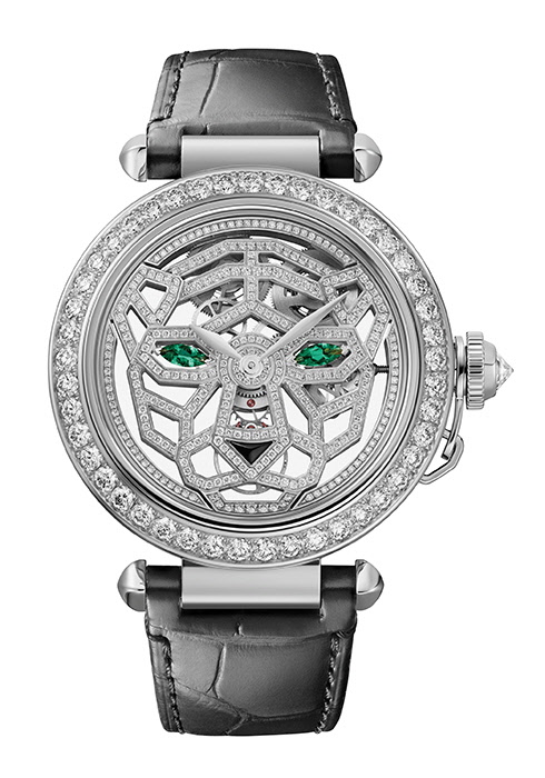 주얼리와 워치메이커로서 까르띠에의 무르익은 역량과 거침없는 장인 기술을 엿볼 수 있는 파샤 드 까르띠에 스켈레톤 워치. 메종을 상징하는 팬더를 모티브로 베젤과 팬더 모양 브리지에 브릴리언트 컷 다이아몬드를 장식하고, 마키즈 컷 에메랄드로 펜더의 눈을, 블랙 오닉스로 코를 표현해 매력적이고 관능적이다. 퀵 스위치 시스템을 적용한 다크 그레이 앨리게이터 가죽 스트랩으로 품격을 더했다. 72시간의 파워 리저브 기능을 갖춘 매뉴얼 와인딩 메캐니컬 무브먼트 9625MC로 구동한다. 1억6천만원대. 문의 1566-7277