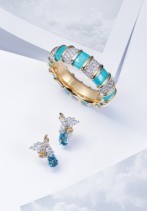 티파니 슐럼버제 이어링 대표 이어링으로 18K 옐로 골드와 플래티넘에 총 1.76캐럿, 72개의 라운드 브릴리언트 컷 다이아몬드를 세팅한 잎 모양 아래 탐스러운 열매가 달린 듯한 총 9.09캐럿의 아콰마린 2개를 매치해 창의적이고 위트 있는 디자인을 완성했다.