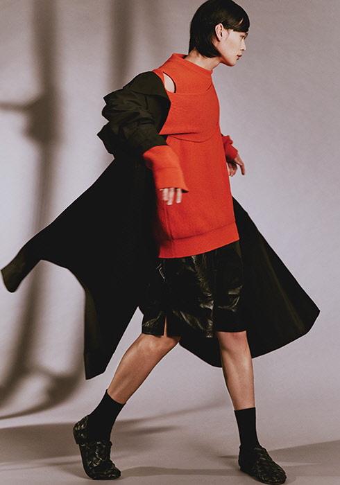 블랙 트렌치코트 가격 미정, 오렌지 니트 톱 2백76만원, 블랙 레더 쇼츠 2백98만원, 블랙 슬립온 2백7만5천원 모두 보테가 베네타.