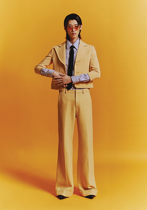 옐로 재킷 2백82만원, 스트라이프 셔츠 74만원, 옐로 팬츠 1백33만원, 블랙 부츠 가격 미정 모두 구찌.