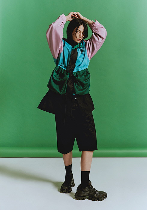 멀티컬러 나일론 개버딘 재킷 가격 미정, 블랙 셔츠 가격 미정, 블랙 코튼 치노 버뮤다 가격 미정, 클라우드 버스트 스니커즈 1백20만원대 모두 프라다.