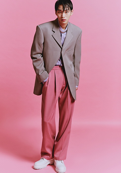 그레이 재킷 4백55만원, 퍼플 컬러 셔츠 83만원, 핑크 컬러 팬츠 1백50만원, 화이트 스니커즈 1백64만원, LV 체인 링크 목걸이 1백45만원 모두 루이 비통.