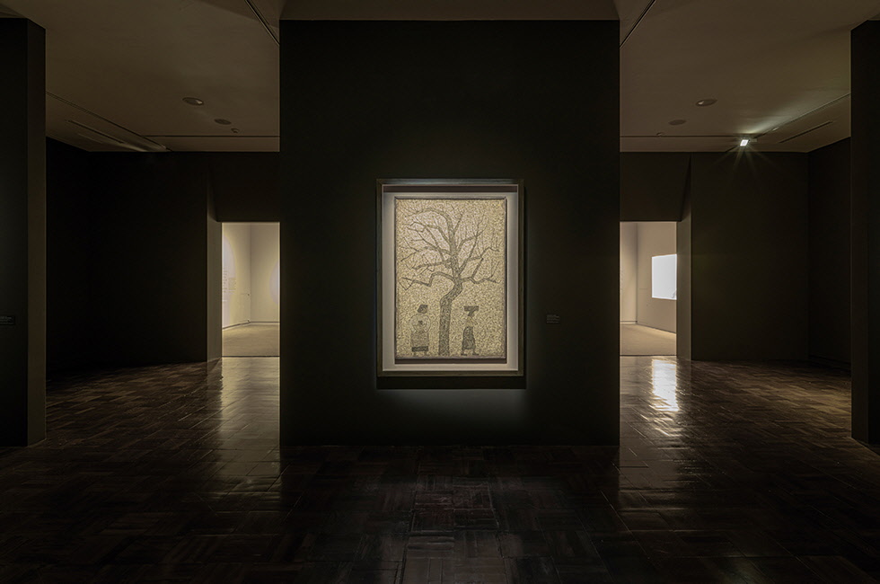 9 박수근의 고향 강원도 양구에서 작가가 즐겨 그렸다고 전해지는 느릅나무 이미지가 보이는 4부 전시 공간.
