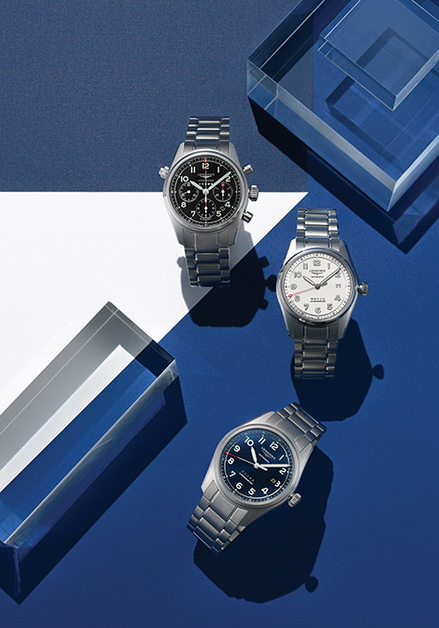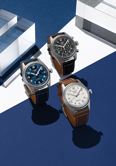 (위부터) 브라운 레더 스트랩 버전의 론진 스피릿 크로노그래프. 항공 시계의 요소를 녹여낸 디자인이 특징으로, 1940년대의 전형적인 셰이프와 구조를 차용한 케이스, 계단식 베젤, 톱니 모양의 빅 스크루 다운 크라운, 사파이어 돔형 글라스 등이 돋보인다. 손목의 움직임으로 원치 않게 날짜가 변경되는 것을 방지하고자 톱니 모양 스크루 다운 푸시 버튼을 장착했다. 셀프 와인딩 메캐니컬 무브먼트 L688.4가 한 치의 오차도 없는 크로노그래프 기능을 제공한다. 이를 가리키는 핸즈 끝에 레드 컬러 포인트를 더해 항공 시계의 유산을 계승하는 모델의 정체성을 강조했다. 4백10만원. 블루 선레이 다이얼과 유사한 블루 컬러의 레더 스트랩을 매치해 감각적인 스타일링이 가능한 모델. 지름 42mm의 스틸 케이스를 장착했고, 케이스 백에는 론진의 정신을 상징하는 모티브와 해당 모델을 설명하는 요소를 인그레이빙했다. 시간당 2만5천2백 회 진동하는 셀프 와인딩 메캐니컬 무브먼트 L888.4로 구동한다. 3백만원. 가독성을 중시하는 항공 시계의 전형적인 아라비아숫자 인덱스를 차용한 그레인드 실버 다이얼, 자연스러운 질감을 살린 밝은 브라운 컬러의 레더 스트랩이 어우러져 클래식한 무드를 드러내는 모델. 지름 40mm의 다이얼에 배치한 플랜지와 아워 서클 사이 다이아몬드 모티브 역시 1920~40년대에 생산된 항공 시계의 미학적 특질로, 과거 파일럿이 디스플레이를 신속하고 분명하게 읽을 수 있도록 도와준 장치다. 인덱스, 핸즈와 함께 슈퍼 루미노바 처리해 어둠 속에서도 쉽게 시간을 확인할 수 있어 유용하다. 2백90만원. 모두 론진.