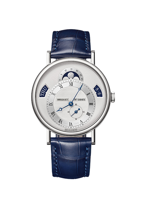 1 2022년 신제품으로 선보이는 클래식 캘린더 7337. 화이트 골드 버전으로 미드나잇 블루 컬러 앨리게이터 스트랩을 매치했다.