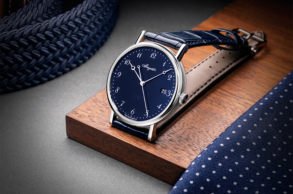 클래식 그랑 푀 블루 에나멜 5177 브레게의 현행 컬렉션 중 최초로 블루 에나멜 다이얼을 접목한 모델. 하우스를 상징하는 다크 블루(브레게 블루) 색상의 에나멜 다이얼을 통해 클래식 컬렉션 고유의 정제된 미학을 극대화했다. 하우스 매뉴팩처는 이와 같은 특별한 컬러를 구현하기 위해 안료 개발부터 생산 과정 전반에 걸쳐 방대한 연구를 진행했다. 영롱한 다이얼 위로 은색의 분말을 분사하는 매우 섬세한 작업을 통해 약간 도톰한 부조 형태로 새겨 넣은 아라비아숫자 인덱스, 눈금을 대신하는 별과 다이아몬드 형태, 백합 문양(fleur-de-lis)이 돋보인다. 문 팁 핸즈 또한 파란 배경 위에서 잘 보이도록 스틸 소재에 수작업으로 로듐 코팅 처리했다. 다이얼 3시 방향에는 동일한 블루 & 실버 스타일의 날짜창을 배치하고, 6시 방향에는 고유의 시크릿 시그너처를 에나멜링으로 장식했다. 이는 1787년 출시한 브레게 No.15 셀프와인딩 워치에서도 볼 수 있는 요소로, 브레게 컬렉션 가운데 에나멜 다이얼을 장착한 모델은 모두 아브라함-루이 브레게가 사용했던 캘리그래피를 동일하게 적용하고 있다. 실리콘 소재의 레버와 밸런스 스프링, 이스케이프 휠을 갖춰 뛰어난 항자성을 자랑하는 인하우스 셀프 와인딩 칼리버 777Q로 구동하며, 엔진 터닝 장식의 골드 로터가 특징으로 보이지 않는 각 부품에도 챔퍼링, 서큘러 그레이닝, 브러싱, 코트 드 제네바 등의 기법을 사용해 섬세하게 마무리했다. 정교한 홈이 파인(fluted) 매끈한 화이트 골드 케이스의 지름은 38mm, 두께는 8.8mm로 화이트 골드 핀 버클을 장착한 미드 나잇 블루 컬러 앨리게이터 레더 스트랩을 매치했다. 각 시계 뒷면에는 고유 번호를 인그레이빙해 더욱 특별하다.