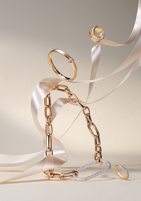 지름 약 12.45mm의 볼드한 볼륨이 특징인 18K 로즈 골드 소재의 이코니카 맥시 링, 18개의 다이아몬드를 섬세하게 세팅해 우아한 멋을 배가했으며, 매끄러우면서도 대담한 느낌을 주는 18K 로즈 골드 소재의 이코니카 뱅글, 총 4.2캐럿의 4백22개 다이아몬드로 장식한 오버사이즈 링크 스냅 클로저가 특징인 18K 로즈 골드 소재의 이코니카 네크리스, 38개의 다이아몬드를 파베 세팅해 은은하고 고급스러운 무드를 전하는 18K 로즈 골드 소재의 이코니카 링 모두 가격 미정 포멜라토.