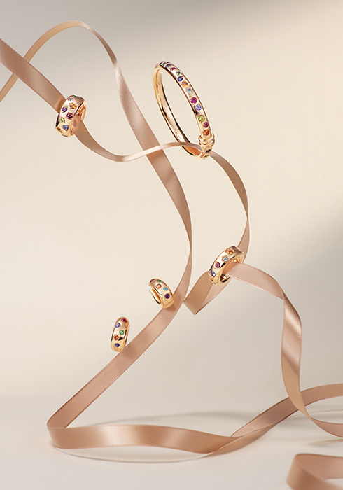 총 2.5캐럿의 핑크 투르말린, 오렌지 사파이어, 블루 사파이어, 차보라이트, 레드 스피넬, 블루 지르콘, 탄자나이트, 디멘토이드, 애미시스트를 세팅한 이코니카 멀티컬러 링, 컬렉션의 아이코닉하고 볼륨감 있는 실루엣이 시선을 사로잡으며, 총 5.1캐럿의 다채로운 원석을 세팅한 18K 로즈 골드 소재의 이코니카 멀티컬러 브레이슬릿, 다양한 컬러감을 자랑하는 총 1.9캐럿의 스톤이 눈길을 끄는 18K 로즈 골드 소재의 이코니카 멀티컬러 링, 별, 삼각형, 사각형의 유희적인 무드로 스톤을 세팅한 18K 로즈 골드 소재의 이코니카 이어링 모두 가격 미정 포멜라토. 문의 02-3143-9486