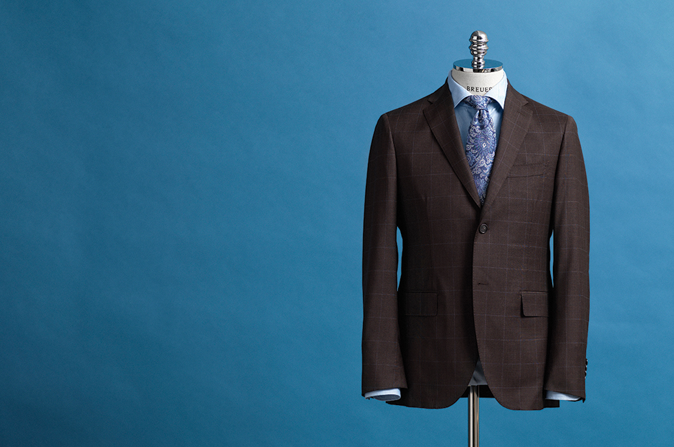윈도페인 체크 패턴을 가미한 브라운 컬러 수트 1백69만원대, 블루 셔츠 29만9천원, 페이즐리 패턴 타이 18만9천원 모두 브로이어