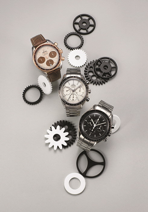 (위부터) 지름 38mm의 스틸 & 세드나 골드 케이스에 카푸치노 다이얼과 타키미터 스케일의 브라운 알루미늄 링을 장착한 남녀 공용 ‘스피드마스터 38 코-액시얼 크로노그래프 카푸치노’ 7백만원대. 스몰 세컨즈, 30분 카운터, 12시간 카운터, 날짜창이 완벽한 균형을 이루는 오팔 실버 컬러 다이얼을 장착한 ‘스피드마스터 레이싱 코-액시얼 크로노그래프’. 남성 손목에 적당한 지름 40mm 사이즈로 코-액시얼 칼리버 3330으로 구동한다. 5백만원대. 달 탐사 시 사용한 유서 깊은 핸드와인딩 크로노그래프 칼리버 1861을 적용한 ‘스피드마스터 문워치 프로페셔널 크로노그래프’. 지름 42mm의 스틸 케이스와 브레이슬릿, 타키미터 스케일을 새긴 블랙 베젤과 다이얼이 어우러져 멋스럽다. 6백만원대. 모두 오메가.