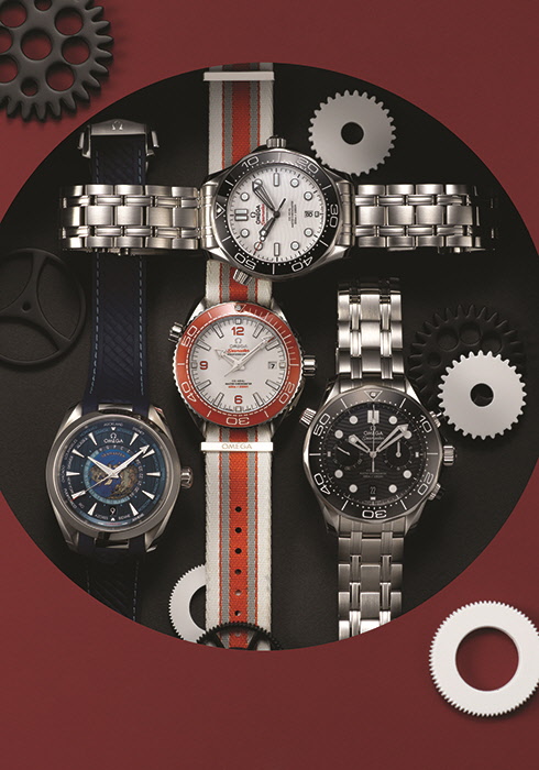 (위부터 시계 방향으로) 물결 패턴을 각인한 화이트 세라믹 다이얼에 슈퍼 루미노바 처리한 아워 마커와 핸즈, 다이빙 스케일을 표시한 블랙 세라믹 베젤, 커다란 날짜창을 더해 다이버 워치의 면모를 강조한 ‘씨마스터 다이버 300M 오메가 코-액시얼 마스터 크로노미터’. 케이스 지름 42mm로 55시간의 파워 리저브와 300m 방수 기능을 제공하는 오메가 마스터 크로노미터 칼리버 8800을 탑재했다. 6백만원대. 지름 44mm의 스틸 케이스에 블랙 세라믹 다이얼을 더한 ‘씨마스터 다이버 300M 오메가 코-액시얼 마스터 크로노미터 크로노그래프’. 3시와 9시 방향에 각각 위치한 12시간 및 60분 카운터가 균형을 이루며 정교한 타임존 기능을 제공한다. 9백만원대. 화사한 오렌지 컬러 인덱스와 단방향 베젤, 삼색 스트라이프 나토 스트랩이 어우러진 스타일리시한 디자인이 돋보이는 ‘씨마스터 플래닛오션 600M 오메가 코-액시얼 마스터 크로노미터’. 600m 방수 기능을 제공하며 지름 43.5mm 사이즈로 남성은 물론 오버사이즈 워치를 즐기는 여성도 착용 가능하다. 7백만원대. 레드 컬러로 처리한 GMT 시간을 기준으로 서머 타임을 적용하는 도시와 그렇지 않은 도시를 각각 실버·블루 컬러로 표시해 세계 각지의 시간을 빠르고 쉽게 확인할 수 있는 ‘씨마스터 아쿠아테라 150M 오메가 코-액시얼 마스터 크로노미터 GMT 월드타이머’. 다이얼 중앙에 배치한 24시간 글라스 링은 낮과 밤 인디케이터 역할을 하며 레이저 가공으로 표현한 푸른 바다와 대륙 모티브가 아름답다. 1천1백만원대. 모두 오메가.