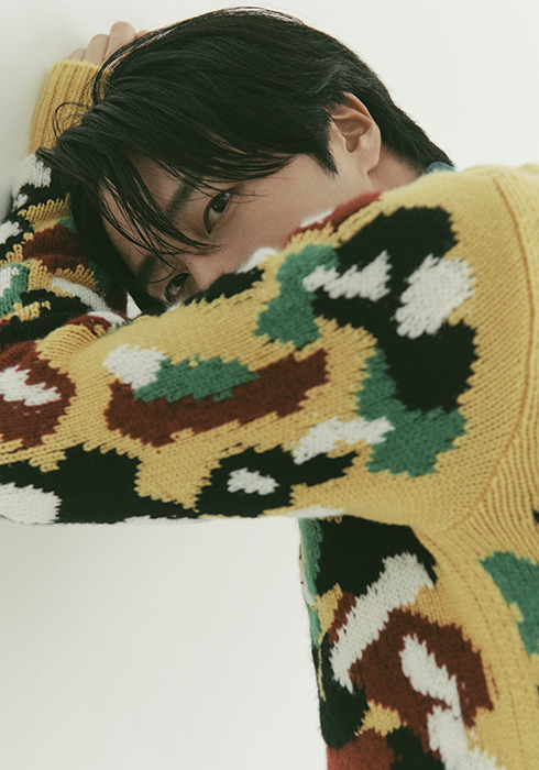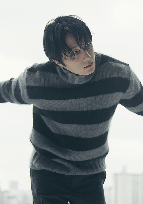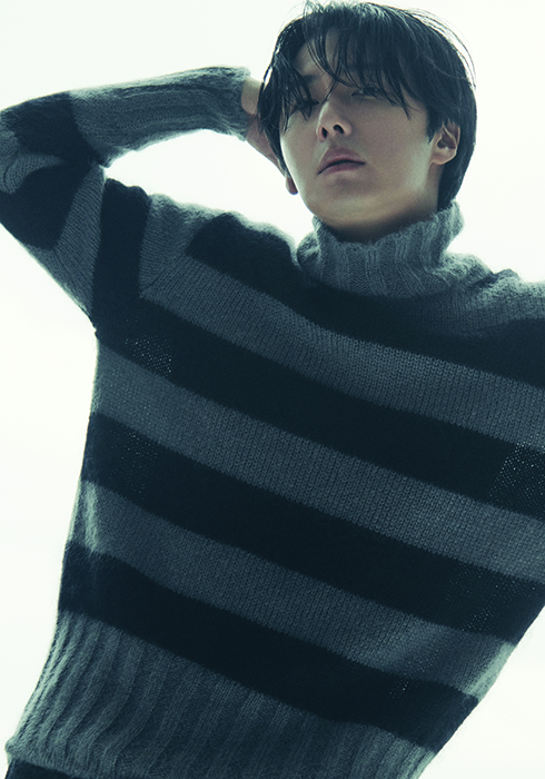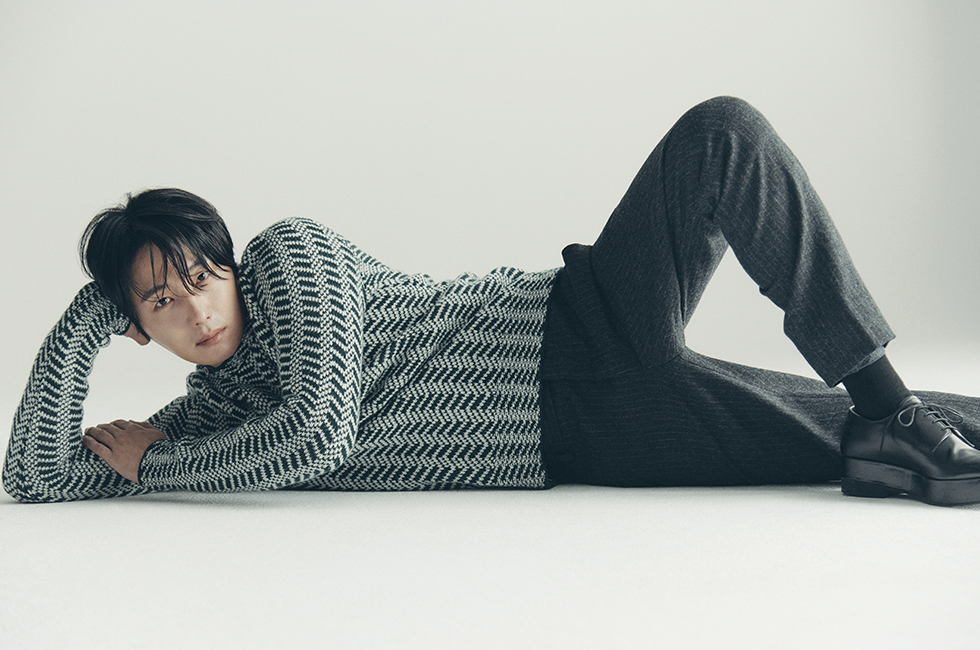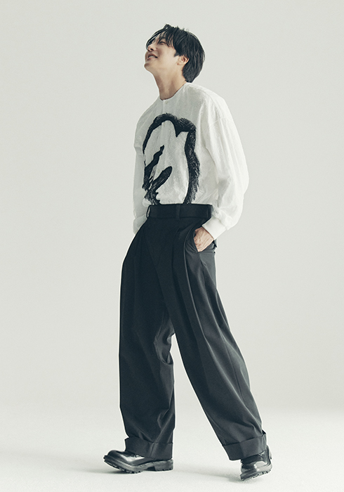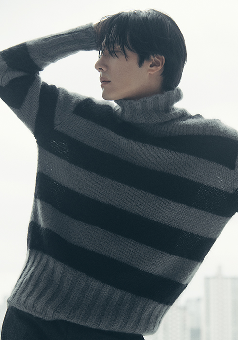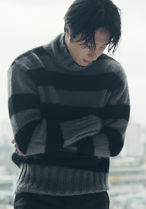 롱 슬리브 니트 풀오버, 와이드 울 팬츠 모두 가격 미정 에르메네질도 제냐. 화이트 카프 레더 스니커즈 가격 미정 처치스. 오른손 약지에 착용한 비제로원 화이트 골드 링 3백만원대 불가리. |
