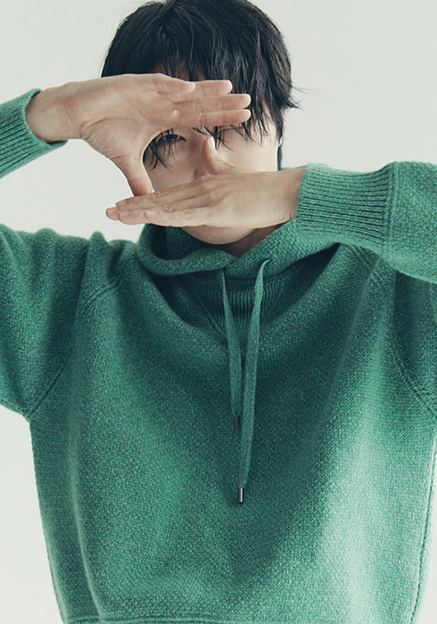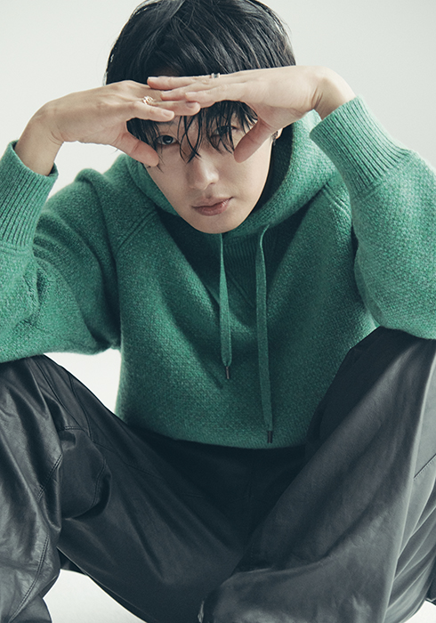 그린 컬러 캐시미어 후드 스웨터 2백79만원, 블랙 나파 레더 카고 팬츠 가격 미정 모두 살바토레 페라가모. 왼손 중지에 착용한 비제로원 블랙 세라믹 & 로즈 골드 링 2백만원대 불가리. 오른손 약지에 착용한 클래쉬 드 까르띠에 핑크 골드 링 3백86만원 까르띠에. |
