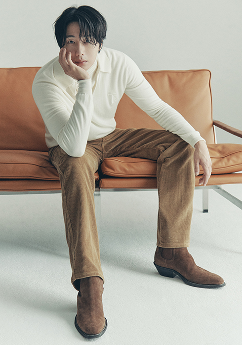 크림색 울 터틀넥 70만5천원, 모노그램 자수 장식 니트 폴로 셔츠 70만5천원, 벨벳 코듀로이 팬츠 70만5천원, 스웨이드 첼시 부츠 1백12만5천원 모두 토즈. |