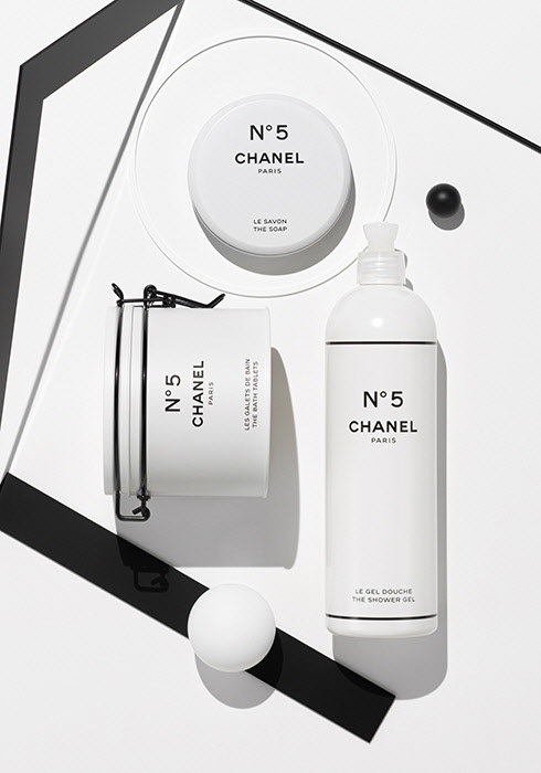 향기와 깨끗함, 두 가지 매력을 모두 담은 N°5 솝 90g 6만7천원, 풍성한 거품을 내는 여유로운 향의 N°5 샤워 젤 500ml 9만2천원, 귀여운 틴 케이스를 열어 낱개로 포장된 제품을 따뜻한 물을 채운 욕조에 녹인 후 몸을 담그면 피로가 사르르 풀리는 N°5 배쓰 밤 17g X 10ea 9만9천원 모두 샤넬.
