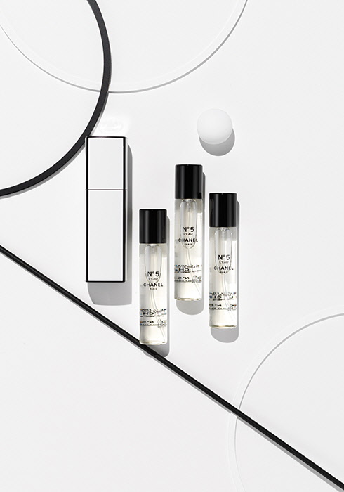 립스틱과 같은 아이코닉한 패키지에 담은 스프레이. 패키지를 한 손으로 트위스트한 후 가볍게 눌러주면 열리는 N°5 로(L’EAU) 미니 트위스트 앤 스프레이 7ml 5만9천원, 미니 트위스트 앤 스프레이 리필 7ml X 3ea 9만9천원 샤넬.