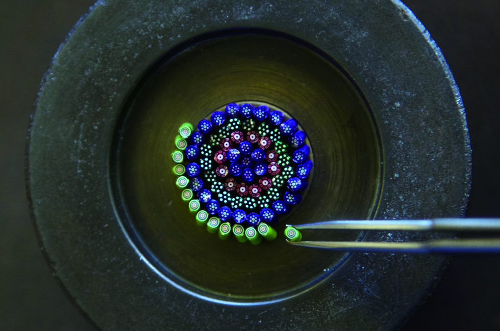 4 유리 공예 장인이 유리 줄기로 밀레피오리 패턴을 만드는 모습.