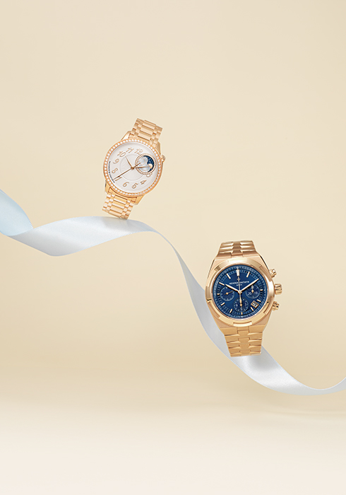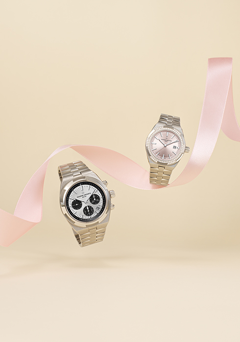 오버시즈 컬렉션의 아이코닉한 블루 래커 다이얼과 18K 5N 핑크 골드 소재의 조화가 고급스러운 느낌을 선사한다. 직경 42.5mm 케이스 안 날짜 표시창, 크로노그래프 카운터가 돋보이며, 말테 크로스 모양의 스크루로 장식한 칼럼 휠과 916/1000 골드 로터가 특징인 인하우스 셀프 와인딩 무브먼트 칼리버 5200으로 구동한다. 또 손쉽게 교체할 수 있는 브레이슬릿과 스트랩을 함께 제공해 높은 활용도가 돋보인다. 모두 가격 미정. 문의 1877-4306