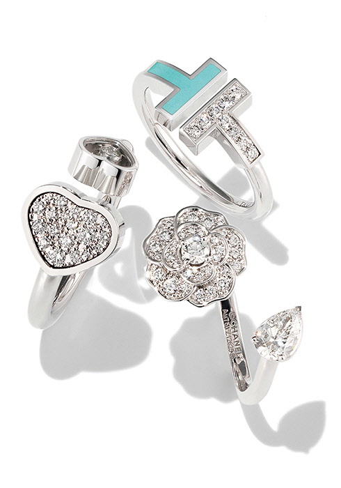 티파니 T 스퀘어 링 18K 화이트 골드에 다이아몬드와 터쿼이즈로 티파니의 상징적인 T 모티브를 표현한 링 가격 미정. 문의 02-6250-8600 샤넬 화인 주얼리 카멜리아 프레씨유 링 화이트 골드에 페어 컷 다이아몬드 1개와 라운드 컷 다이아몬드 32개로 이뤄진 카멜리아 플라워 모양 링 가격 미정. 문의 080-200-2700, chanel.com 쇼파드 해피 H 링 화이트 골드에 다이아몬드를 세팅한 빅 하트와 0.04캐럿 무빙 다이아몬드 1개를 배치한 스몰 하트로 장식한 링 4백45만원. 문의 02-6905-3390