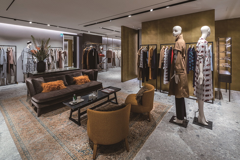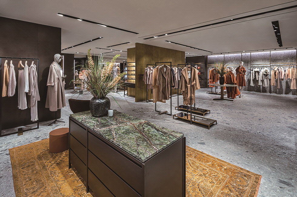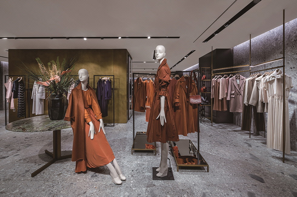 막스마라 매장은 단순히 상품을 팔기 위한 공간이 아니라 고객의 요구를 충족시키며 커뮤니케이션하는 공간이다. 1967년 밀라노 코르소 비토리오 에마누엘레(Corso Vittorio Emanuele)에 숍을 오픈할 때 의류, 가방, 신발이 자유롭게 섞인 디스플레이를 선택해, 당시에는 파격적인 방식으로 공간을 채우며 오늘날 패션 스토어 콘셉트의 선구자 역할을 하기도 했다. 게다가 아방가르드한 공간에 잘 어울리는 여러 디자이너의 장식물을 매치해 시선을 끌기도. 패션 하우스가 한 도시에 플래그십 스토어를 오픈한다는 것은 많은 의미를 지닌다. 현재 고객 외에도 더 많은 잠재 고객이 있다는 확신, 제품은 물론 브랜드의 문화와 철학까지 이해하고 즐길 수 있다는 신뢰, 그리고 특별한 스토리를 담을 수 있는 썩 괜찮은 지리적 위치 등 많은 것이 충족되어야 하기 때문이다. 그런 점에서 국내에서 첫 번째로 선보이는 막스마라 서울 플래그십 스토어는 모든 면에서 평균 이상이다. 국내 패션을 선도하는, 다시금 주목받고 있는 청담 패션 거리에 위치한 이 스토어의 디자인을 담당한 건축가는 두치오 그라시(Duccio Grassi). 건물 정면에 시원하게 창을 내 독특하고 깔끔하며 투명한 느낌을 강조했다. 핸드메이드로 제작한 브라스 장식이 인상적인 특별한 외벽, 자연석과 오크우드, 에칭 처리한 철 소재가 어우러져 만들어내는 광택이 낮과 밤 모두 다른 빛을 내 멋스럽다. 입구와 일부 벽면은 이탈리아 왕족의 저택에 사용하던 고급스러운 체포(ceppo) 스톤으로 제작했고, 매장 내 바닥을 오크우드로 마무리해 편안한 거실 같은 느낌을 살렸다.
