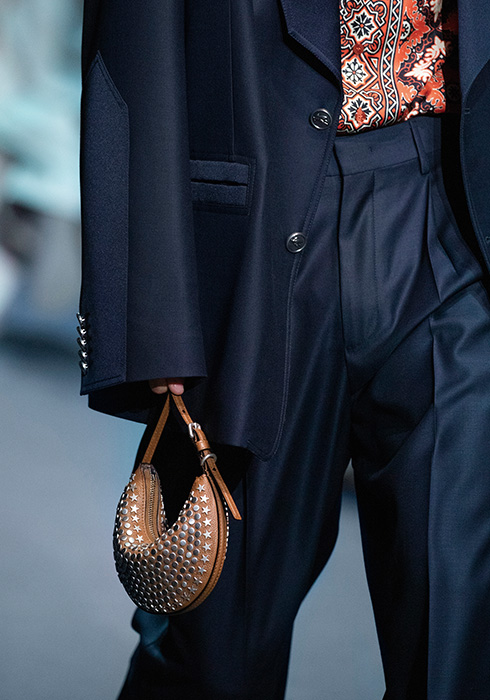 2024 S/S 맨즈 컬렉션 또한 소재가 아주 독특하고 재미있다. 바로 에트로앨러고리(Etroallegories). 그 시작은 마르코 드 빈센조가 자신의 고향을 방문하던 중, 체사레 리파(Cesare Ripa)의 <아이코놀로지(Iconology)>라는 서적 사본을 발견하면서부터다. 이 책은 17세기의 미덕, 자질, 부도덕 등을 묘사한 우화적 이미지로 가득했고, 마르코는 이 과거의 심오한 비밀과 은밀한 의미가 가득한 흥미로운 표현에서 영감받아 현대적으로 형상화했다. 그것이 바로 2024 S/S 맨즈 컬렉션으로 탄생한 것이다. 오래된 서점에서 우연히 발견한 작자 미상의 우화집을 현재의 패션 산업과 연관시킨 그의 능력이 놀라울 뿐. 얼핏 보기에도 다른 시대의 유물처럼 느껴지는 우화지만 어쩌면 거기서 마르코는 현대의 단면을 발견했을지도 모른다. 디자인을 하고 그에 따라 의상을 제작해 쇼에서 선보이는 것 역시 어쩌면 이미지 메이킹에 의사소통 능력을 부여하는 우화적이고 비유적인 행동이라 할 수 있겠다. 새로운 에트로 컬렉션은 바로 이러한 의도적이고 직관적이며 비과학적인 사고에서 기인한다. 몸에 거의 닿지 않고 유려하게 흐르는 형태와 리드미컬한 패턴을 가득 믹스 매치한 스타일은 편안함과 동시에 신성함까지 풍기는 것. 넉넉한 블레이저부터 버뮤다, 점프수트, 퍼지한 점퍼, 풋볼 톱은 긴 카디건과 두꺼운 담요로 만든 코트와 조화롭게 어울린다. 더불어 소원(augurio buono), 아름다움(bellezza), 영원(eternita`), 정욕(lussu˙ria), 강인함(tenacita`)을 표현하는 우화적 이미지를 프린트와 자카드 여기저기에 반짝이는 터치로 가미해 극적인 느낌을 극대화한다. 반면 하이퍼-벌커나이즈드 왈라비 슈즈, 스퀘어 토 셰이프의 돌(doll) 슈즈, 인타르시아 백 같은 액세서리를 통해 엄숙함과 동시에 재미있는 디테일이 더해져 옷을 감상하는 내내 즐거움을 선사한다. 이번 컬렉션이 더 특별한 이유는 사필로(Safilo)와 파트너십으로 디자인, 제작 및 유통되는 새로운 아이웨어 컬렉션을 선보였기 때문이다. 최첨단 실루엣과 독창적인 시그니처 디테일이 특징. 오버사이즈 형태의 대담한 구조와 기하학적인 다리에 자유와 에너지 및 창의성을 상징하는 페가수스(Pegaso) 디테일을 담았다. 이는 고대 신화의 매력을 현대적인 스타일로 표현한 에트로스크린(ETROSCREEN) 스타일의 극치를 보여준다. 2024년 1월 정식 출시 예정이며, 2023년 11월에는 새로운 아이웨어 컬렉션의 프리뷰 제품들을 에트로 부티크 및 일부 안경점에서 첫선을 보일 예정이다.