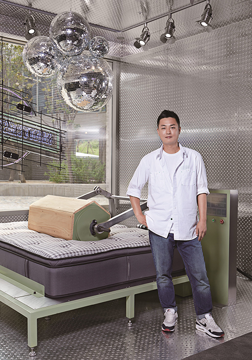 Q 시몬스 라운지의 개관 전시 작가로 참여하게 된 계기는? 시몬스에서 새로운 공간인 시몬스 테라스를 오픈하며 작품 전시를 열도록 초대해주었습니다. 저는 언제나 상업성과 작품성의 균형을 맞추려고 합니다. 이 작품은 이미 존재하는 재료와 공간에서 진행한다는 점에서 실용적인 편이지만, 동시에 수면을 위한 공간에서 익살스러운 작품을 창조하고 그 과정을 강조한다는 점에서 새로운 문화를 만들 수 있겠다고 생각했습니다. 시몬스에서는 열린 태도로 저와 재미있는 일을 실행하기 위해 다양한 시도를 했습니다. 우리의 열망이 만든 이번 결과물을 많은 이들이 즐기길 바랍니다. Q 이번 전시를 통해 어떤 결과를 기대하고 있는지 이야기해달라. 이번 프로젝트는 시몬스가 대중에게 그들의 공간을 개방해 브랜드의 신뢰도를 높이기 위한 것입니다. 제품이 어디서 어떻게 만들어지는지 아는 것은 매우 중요하기 때문에 정말 좋은 아이디어라고 생각했습니다. 이번 작업을 위해 시몬스 테라스의 사진과 영상을 미리 전달받았습니다. 큼직하고 탁 트인 공간을 보고 졸린 눈을 한 캐릭터에서 영감을 받은 거대한 깃발을 제작하기로 했습니다. 부드럽고 평면적이며 졸려 보이는 거대한 캐릭터와 함께 노는 것이 재미있겠다는 생각이 들었기 때문입니다. 또 다른 작업 중 하나는 ‘잭 인 더 박스(Jack in the Box)’ 시리즈입니다. 졸린 얼굴을 한 잭이 박스에서 두 팔을 벌리며 튀어나오는 상자로, 시몬스 매트리스에 실제로 사용하는 스프링을 적용했습니다. 시몬스의 상징이기도 한 스프링을 통해 재미와 유쾌함을 보여주고 싶었습니다.