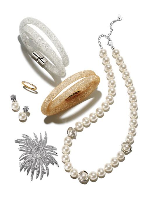 모던한 원형 모티브 펜던트에 크리스털을 파베 세팅한 스톤 펜던트 18만5천원, 세 줄의 밴드 링을 언밸런스하게 매치해 우아한 곡선을 더한 스파이럴 미니 링 21만5천원, 심플한 라인이 돋보이는 레어 링 8만9천원, 스톤 펜던트 네크리스와 함께 매치하면 더욱 매력적인 스톤 이어링 21만5천원, 모던하고 심플한 메탈 밴드에 크리스털로 포인트를 준 택틱 뱅글 21만5천원 모두 스와로브스키.