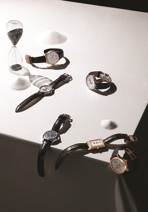 피아제 구버너 워치 원형과 타원형이 조화를 이루는 독특한 형태의 핑크 골드 케이스 안에 퍼페추얼 캘린더가 완벽한 균형을 이루고 있다. 자체 제작 울트라 신 셀프와인딩 무브먼트 855P를 탑재, 다이얼을 통해 시, 분, 스몰 세컨즈, 세컨드 타임존, 낮·밤 인디케이터, 레트로그레이드 방식의 요일과 날짜, 달, 윤년을 모두 읽을 수 있다. 7천만원대. 문의 02-540-2297