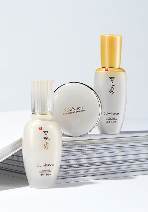 설화수 스킨케어의 시작과 끝을 책임져 맑은 윤기와 촉촉함을 붙들어준다. 미안피니셔(80ml 9만원대), 퍼펙팅 쿠션(15gX2 6만원대), 윤조에센스(60ml 8만5천원대).