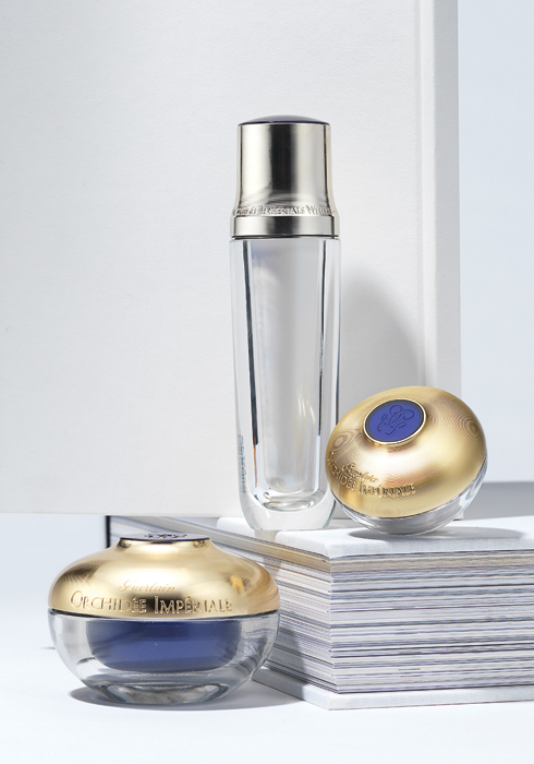 겔랑 고농축 오키드를 함유한, 브랜드의 상징으로 꼽히는 얼굴들. 골드 오키드 임페리얼 크림(50ml 54만원대), 오키드 임페리얼 화이트 세럼(30ml 59만5천원대), 골드 오키드 임페리얼 아이 앤 립 크림(15ml 26만원대).
